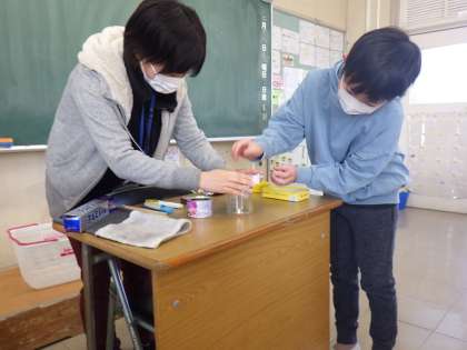 現在、感染症防止のため理科では、班で顔を寄せ合う理科の実験を控えています。