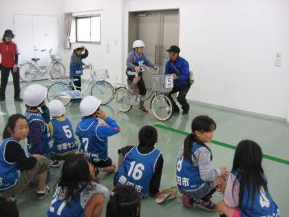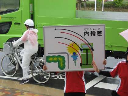 大型車の内輪差について学んだあと、自転車の点検の仕方や安全な乗り方について丁寧に教えていただきました。ヘルメットの大切さも学びました。