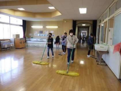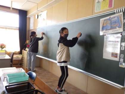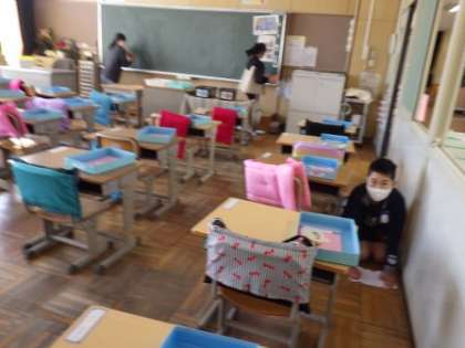 今週は1年生が11:30に下校するため、掃除がありません。翌日も1年生が気持ちよく教室を使えるように、6年生が毎日掃除をしています。床のごみを取り、黒板をきれいにして、机の上の道具箱を整とんします。1年生教室を丁寧に掃除する姿に、6年生の思いやりがこもっていました。