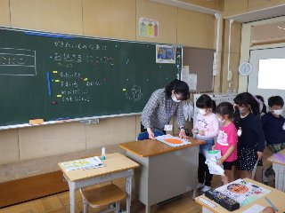 1年生の図工「かきたいものなあに」では、画用紙いっぱいに、にこにこのお日様の絵を書きました。1年生児童は、伸びやかに幸せいっぱいのお日様の絵を描きました。