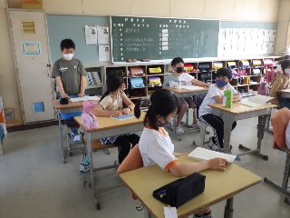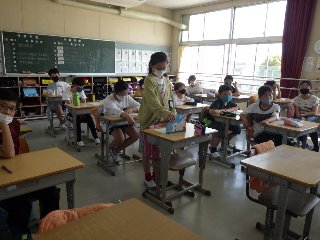 5年生の学活では、級訓について家で考えてきたアイディアを発表しました。「『心をひとつに』がいい。みんな心ひとつに協力できるから」「『協力=強力』協力すると強力な学級になるから」などなど、5年生がその理由までつけて、級訓への思いを述べました。周りの児童は「なるほど〜」「わかる〜」と、うなずいていました。