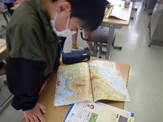 5年生の社会科では、日本の国土について学習しています。今日は地図帳を使うトレーニングとして、日本の県や市を、地図帳から探し出していました。先生が、「長野県」「駒ケ根市」というと、児童は中部地方の地図をじっと見つめて探し出していました。