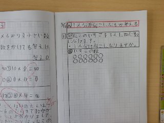 3年生の算数では、わり算を勉強しています。今日は、12個のいちごを3人で同じ数ずつ分けると、一人分はいくつになるかを、図を描いて考えました。