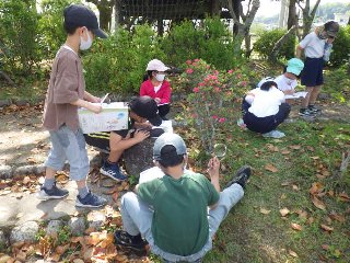 3年生の理科では「生きもののすがた」を学習中です。3年生児童は、理科ノートを持ってふれあいの森へ行き、生きものと植物の観察を行いました。植物にとまった昆虫を見つけたり、葉っぱの裏でたまごを守るクモを見つけたりして、スケッチをしました。