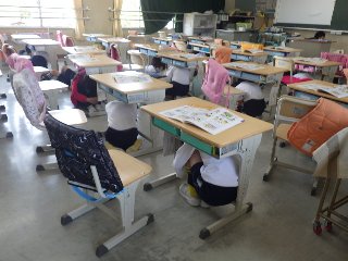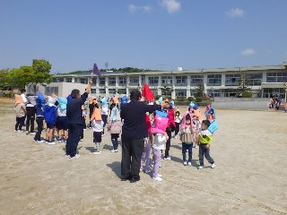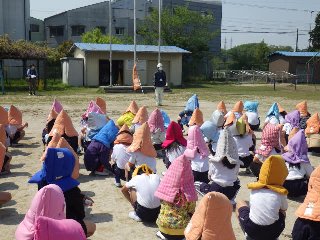 今年度はじめての避難訓練(地震想定)を行いました。放送スピーカーから地震の音が聞こえはじめると、児童は一斉に机の下に隠れました。避難指示とともに廊下に並び、運動場に避難をしました。全員が、自分の命を守る大切さやその方法を学びました。