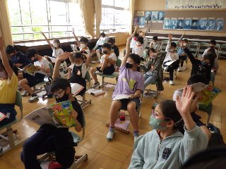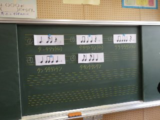 4年生の音楽では、リズム打ちを勉強しています。今日は、まず、四分音符、八分音符、付点四分音符の3つを組み合わせた5つのパターンのリズムを勉強しました。その後、楽譜を見て、1小節ごとにどのパターンのリズムかを考えて発表しました。
