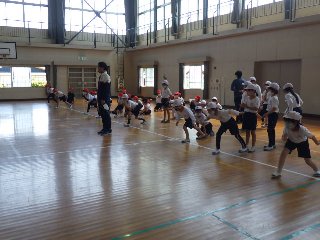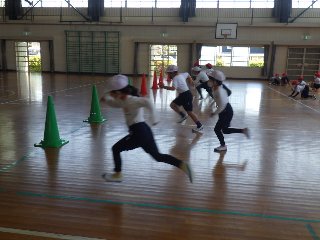 3年生の体育では、50m走の記録向上をめざして、スタートを練習しました。スタートの姿勢や手の振りなどに気をつけて、走りました。