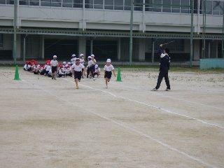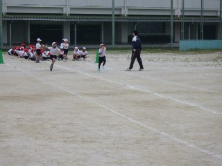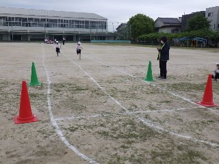 3年生は体育で、50m走を計測しました。前回勉強したスタートの方法を思い出しながら、全力で走りました。