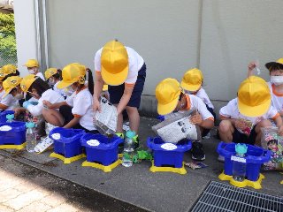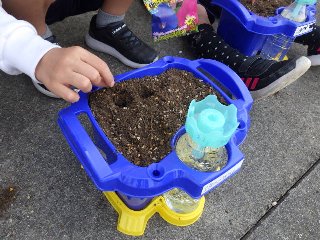 1年生は生活科で、アサガオの種を植えました。ポットに培養土を半分入れ、肥料を混ぜ、培養土の残りを入れました。水を撒いて湿らせたら、指で穴をあけてアサガオの種を6粒まきました。「早く芽を出してね」と言いながら、やさしく土をかけていました。。