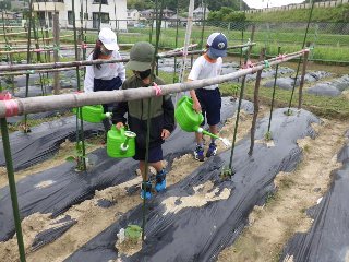 2・1年生は、4月末に植えた野菜のお世話をがんばっています。登校して朝の支度を整えると、早速畑に行って水を汲み、苗ひとつひとつに、丁寧に水をあげています。苗は植えた時よりもずいぶんと大きくなりました。