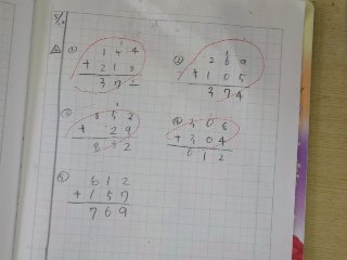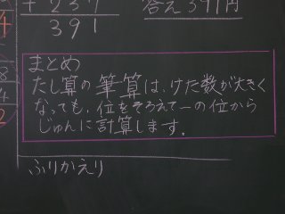 3年生の算数では、「たし算の筆算」を勉強しています。今日は3けた+3けたの筆算のやり方を勉強しました。児童は振り返りで、「楽しくてかんたんだった」「わかったことは、位をそろえて計算することです」「2年生の時にやった2けたの筆算とほとんど同じ」などと書き、理解できたことに満足していました。