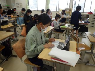 6年生は国語の時間に、明るい社会づくり作文に挑戦中です。今年は原稿用紙に書くのではなく、学習用タブレットとキーボードを使って、自分の考えを打ち込んでいます。