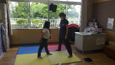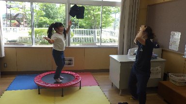 特別支援学級1年生は、自立活動で姿勢保持のために体幹を鍛える運動を楽しみました。1年生児童は、音楽を聞き、歌いながら足でじゃんけんぽんをしました。また、トランポリンをしながら、さまざまな踊りをしました。少しずつテンポがあがっても、リズムに合わせて上手に跳びました。