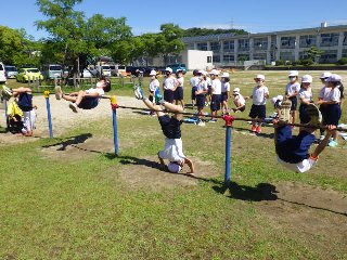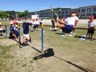 2年生の体育では、鉄棒を行っています。2年生児童は、前回り降り、足掛け回り、地球周り、コウモリなどに挑戦中です。友だちと教え合う姿も、見られます。
