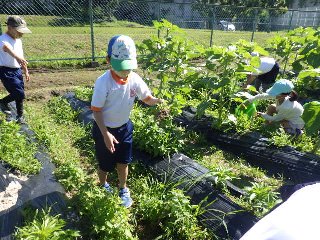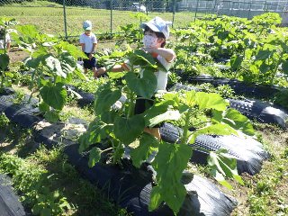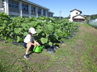 3年生は、理科の観察で使うヒマワリとホウセンカを、学校の畑で育てています。係の児童は、朝の支度を済ませると、畑に行って水やりをしたり、雑草を抜いたりします。ヒマワリの背丈を自分の身長と比べて、「100cmぐらいかな」とつぶやいていました。