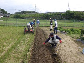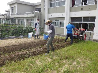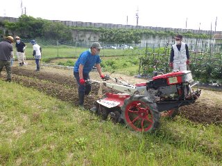 野菜名人さんが、サツマイモの苗植え準備をしました。野菜名人さんが耕運機で耕しながら畝をつくり、肥料をまいて、マルチシートをかけました。6/15に、1・2年生がサツマイモの苗を植えます。