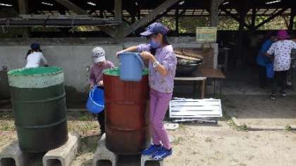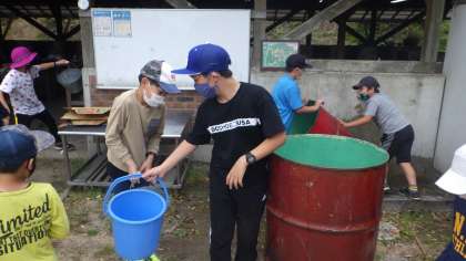 ドラム缶風呂は、水汲みから自分たちで行いました。みんなでバケツリレーを行い、火をくべてお湯を沸かしました。
