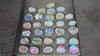 ウッドバッジづくりは、木の表面磨きから始まりました。ツルツル加減を競い合いながら、夢中でつくりました。名前を書いて、カラフルなオリジナル名札が出来上がりました。