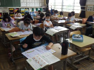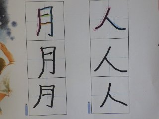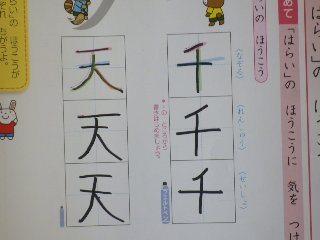2年生の書写では、「左はらい」や「右はらい」に気をつけて字の練習をしました。同じ左はらいでも、「千」「人」「天」「月」に含まれる左はらいは、方向が違うことを学習しました。微妙な方向の違いに気をつけて、字の練習をしました。