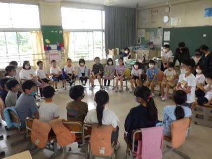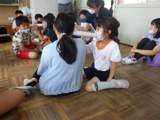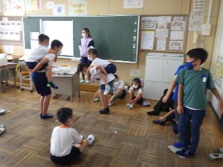 伊保小学校には、10個のフレンド班(縦割り班)があります。それぞれのフレンド班では、6年生が全員で楽しめる遊びを考えました。1〜5年生は、6年生の説明をよく聞いて、1年生から6年生まで一緒になって楽しく遊びました。