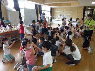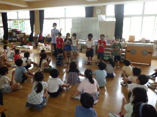 1年生は6月のお誕生日会を行いました。6月にお誕生日を迎える子が前に並び、みんなでお祝いの歌を歌いました。その後、誕生日の子とのじゃんけん大会が行われました。
