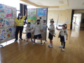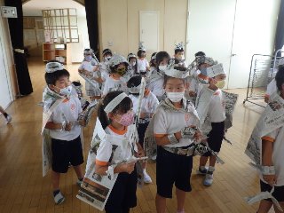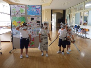 2年生の図工では「しんぶんとなかよし」という単元で、新聞紙を使って、児童が思い思いのかぶり物やマント、剣などを作り、班ごとにポーズを決めて写真を撮りました。2年生児童はみんな、新聞で作ったアイテムを身に付けて、キャラクターになりきっていました。