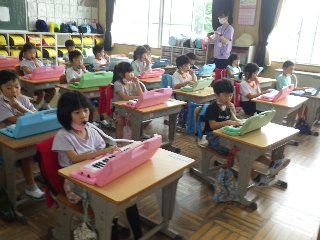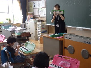 1年生を対象に、鍵盤ハーモニカ講習会がありました。講師の先生は、「『たちつてと』の『と』と言いながら、音を出すんだよ」と教えてくださると、1年生児童は真似をして、「とぅ〜」と言いながらきれいな音を出していました。
