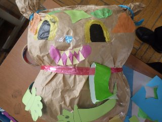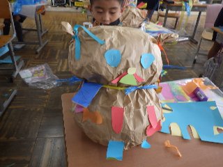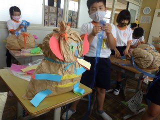 2年生の図工では、「くしゅくしゅ ギュ」という題材で、紙袋を使って「自分がギュッとしたくなるもの」を作りました。ふんわりとした紙袋を顔や体に見立てて、ユニークな作品を作り上げました。