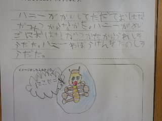 1年生の音楽では、「みつばちハニーのぼうけん」を聴いて、感じたことをワークシートに書きました。「うれしいきょくと、かなしいきょくがあって、うれしかったです。かなしいきょくもあったけど、さいごにうれしいきょくがあって、うれしかったです」と、感じたことを書いていました。