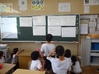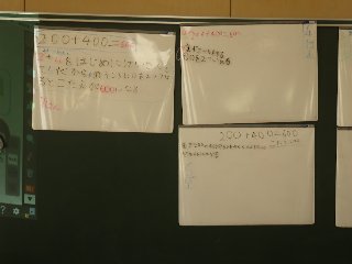 2年生の算数では、200+400の計算の仕方について、班ごとに考えました。「最初に2と4をたして、0を2つくっつけて・・・」と、小さなホワイトボードに書きました。各班の考えを黒板に貼って、全員で各班の考えを見合いました。