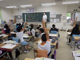 6年生の理科では、「植物の成長と水のかかわり」について、学習しています。7/19の授業では、ホウセンカの葉の裏から水が蒸発しているかどうかを確かめる実験方法について、児童が考え、話し合っていました。「ホウセンカ全体をビニール袋で包む」「葉だけをビニールで包む」などさまざまな意見が出て、友だちの意見に対しての質問や改善案などが出ていました。