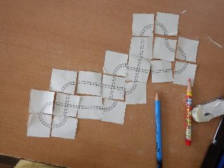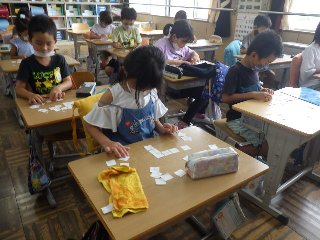 2年生の算数では、「わくわく算数ひろば」というページを使って、線路づくりを行いました。児童は、様々な形の線路を繋ぎ合わせて、1周ぐるりと回れる線路を考えました。19枚の線路を全てつないだ子もいて、みんなが称賛の声をあげていました。