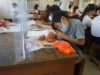 3年生は、図画工作でシーサーを作りました。児童は事前に作りたいシーサーの絵を描いて参加し、講師さんの教えに従って作りました。ユーモラスな顔のシーサーがたくさん出来上がりました。