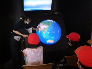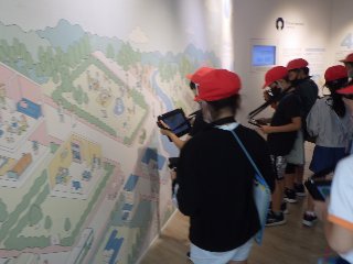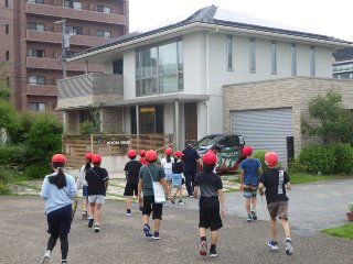 エコフルタウンでは、未来の地球の様子を映像で見たり、水素自動車を見たり、スマートハウス内の様子を見学したりしました。壁に投影された現在の生活の様子にタブレットを向けると、タブレットには50年後の生活の様子が現れました。学校ではロボットが子どもたちを教えていたり、在宅ワークが進んでいたりして、児童は興味をもって50年後の生活を見ていました。