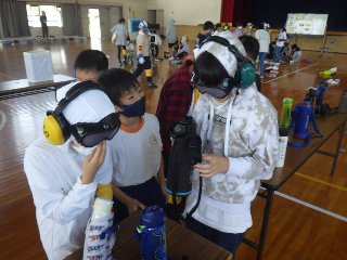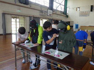 続いて、ゴーグル、イヤーマフ、ヒジやヒザのプロテクター、足首用重り、手袋などを装着して、高齢者疑似体験を行いました。友だちが介助者として隣について、ゆっくりと歩きました。また、ゴーグルをつけたままで字を読んだり、小さなコインを拾ったりして、お年寄りの生活のしづらさを体験しました。