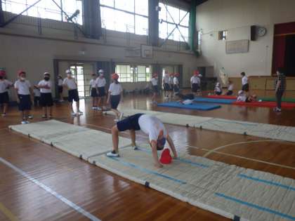 5年生の体育では、器械体操でマット運動に取り組んでいます。回転技、バランス技、支持技の3つを組み合わせて自分の演技を構成し、練習に取り組んでいます。今日は「より美しく見せるにはどうしたらよいか」を考えて練習に取り組みました。「もっと、手を伸ばして」「体が傾いているよ」など、友達同士でアドバイスをしあって、技を磨きました。