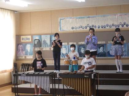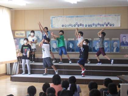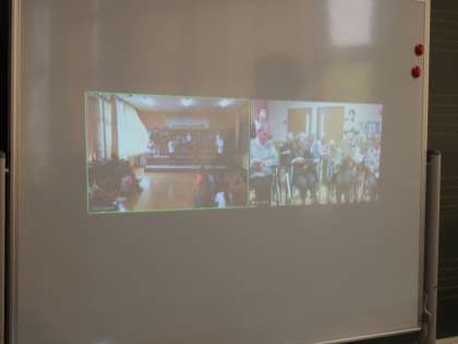 5年生の総合的な学習では、福祉について学習をしています。今日は、地域の高齢者施設とオンラインでつなぎ、交流会を行いました。児童は音楽の授業で練習したリコーダーや楽器を使っての合奏を披露したり、ダンスを披露したりしました。児童が作ったうちわを事前に高齢者施設に届けてあり、そのうちわを振ってお年寄りは応えてくださいました。