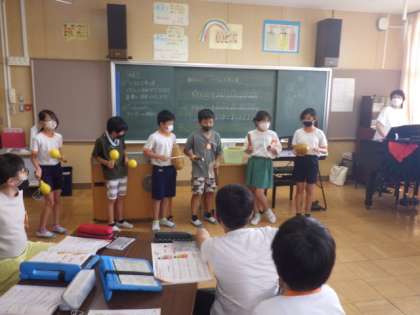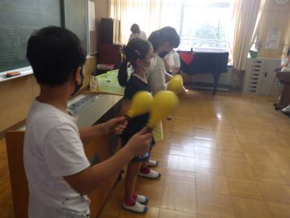 4年生の音楽では、打楽器でリズムをとることを勉強しています。今日は、マラカス、ギロ、クラベルを使って、「いろんな木の実」を演奏しました。リズミカルな音楽に、聴いていいる児童も、歌を歌ったり、踊ったりしていました。音楽室全体が、とても楽しい雰囲気に包まれていました。