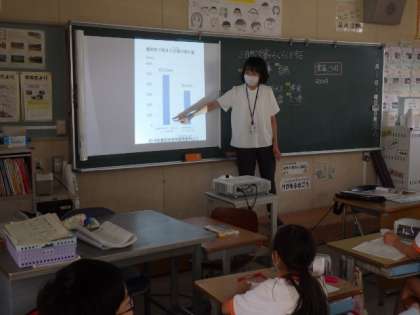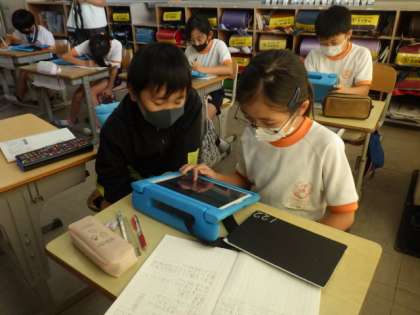 4年生の社会科では、防災について学習をしています。愛知県での大きな災害として、東海豪雨について、調べ学習をしました。教師が災害当日の降水量のグラフを見せると、「え、1か月分より多いじゃん!」と、大量の降水量に驚いていました。学習用タブレットを使って調べて、その被害の大きさを写真や資料から調べてノートにまとめました。