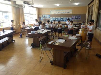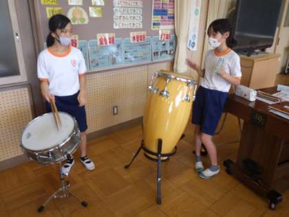 5年生の音楽では、打楽器を使ってのリズム打ちを学習しています。3つのリズムを、様々な楽器を使ってリズミカルに打つ練習をしました。ミッキーマウスマーチに合わせて、打楽器のリズム打ちを楽しみました。
