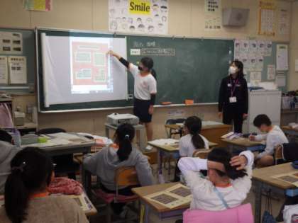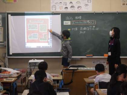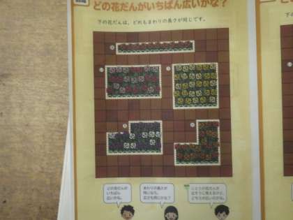 4年生の算数は、面積を学習中です。今日の学習では、5種類の花壇の中で、どれが一番広いかを考えました。「たてが5、横が6だから、5×6=30」など、たてと横の長さから広さを求める方法を発表していました。