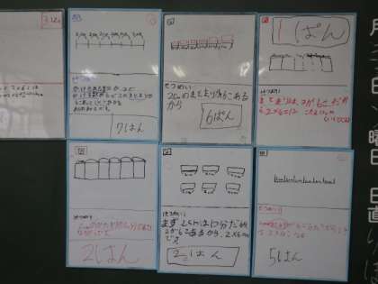 2年生の算数では、習った九九を使って文章題を解いています。今日は「2cmの6倍は何cmですか?」という問題について、班で考え、ホワイトボードに書いて、発表をしました。