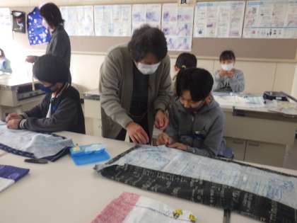 地域の方からミシンの操作法を学んでいるよ(5年生)