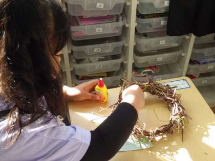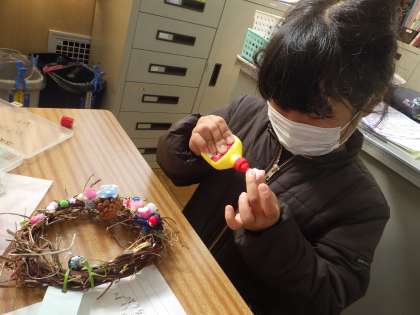1年生の生活科では、サツマイモのつるを使って、リースづくりを行いました。まず乾燥させたつるをぐるぐると巻いて、そこに校庭で拾った木の実や、家から持ってきた小物をつけて、カラフルなリースが出来上がりました。