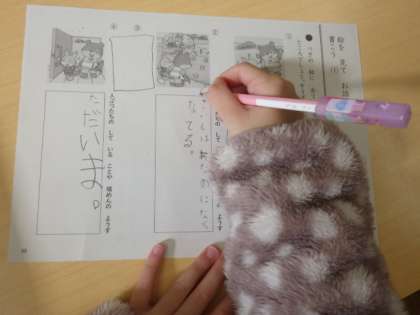 2年生特別支援学級の国語では、絵を見てお話を考えることを学習しています。12/15の学習では、プリントの絵を見て想像をふくらませ、楽しいお話を作り発表しました。