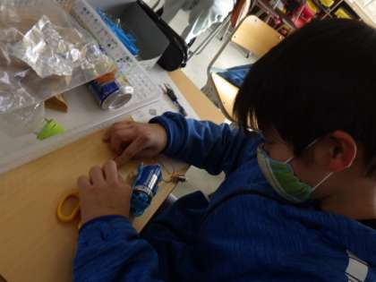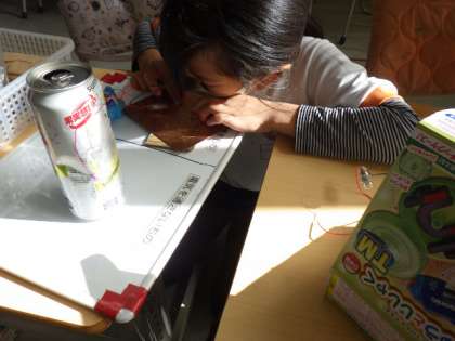 アルミ缶の表面塗料がついたものと、ついていないものについて、電気を通すかどうかも実験しました。表面塗料がついたものでは電気を通さなかったことから、「鉄、銅、アルミなどの金属でてきているものは電気を通す」ということを、児童は理解しました。