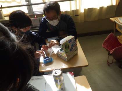 3年生では、理科の授業で研究授業が行われました。身近なもので、どんなものが電気を通すかという問いに、「金属は電気を通す」「ガラスは電気を通さない」と予想しました。予想に基づいて、アルミ缶、スチール缶、わりばし、はさみの取っ手と切るところ、ガラスコップ、輪ゴム、段ボール、ペットボトル、鉄くぎ、銅くぎ、アルミ箔などについて、実験して、電気を通すかどうかを確認しました。