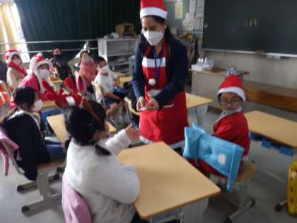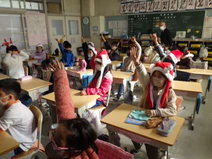 3年生の外国語活動では、クリスマスイベントを楽しみました。クリスマスコスチュームを持ってきた児童もおり、教室には小さなサンタクロースとトナカイがあふれていました。クリスマスソングを歌いながら踊ったり、クリスマスクイズに挑戦したりしました。