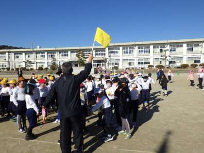 避難指示が出ると、校舎内からクラスごとに運動場へ避難し、運動場にいた子どもたちと合流して人数を確認しました。全校児童が助け合う、よい訓練となりました。