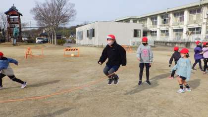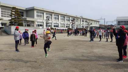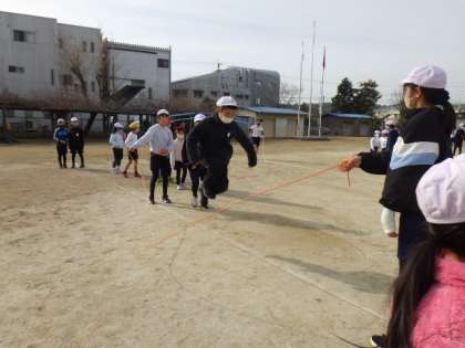 伊保小学校の縦割り班であるフレンド班での長縄練習が、1/13に始まりました。毎週月・水・金の長い休み時間に、フレンド班で8の字跳びを練習します。高学年児童が、低学年に跳び方を教えたり、回数を数えて励ましたりして、とてもよい雰囲気です。